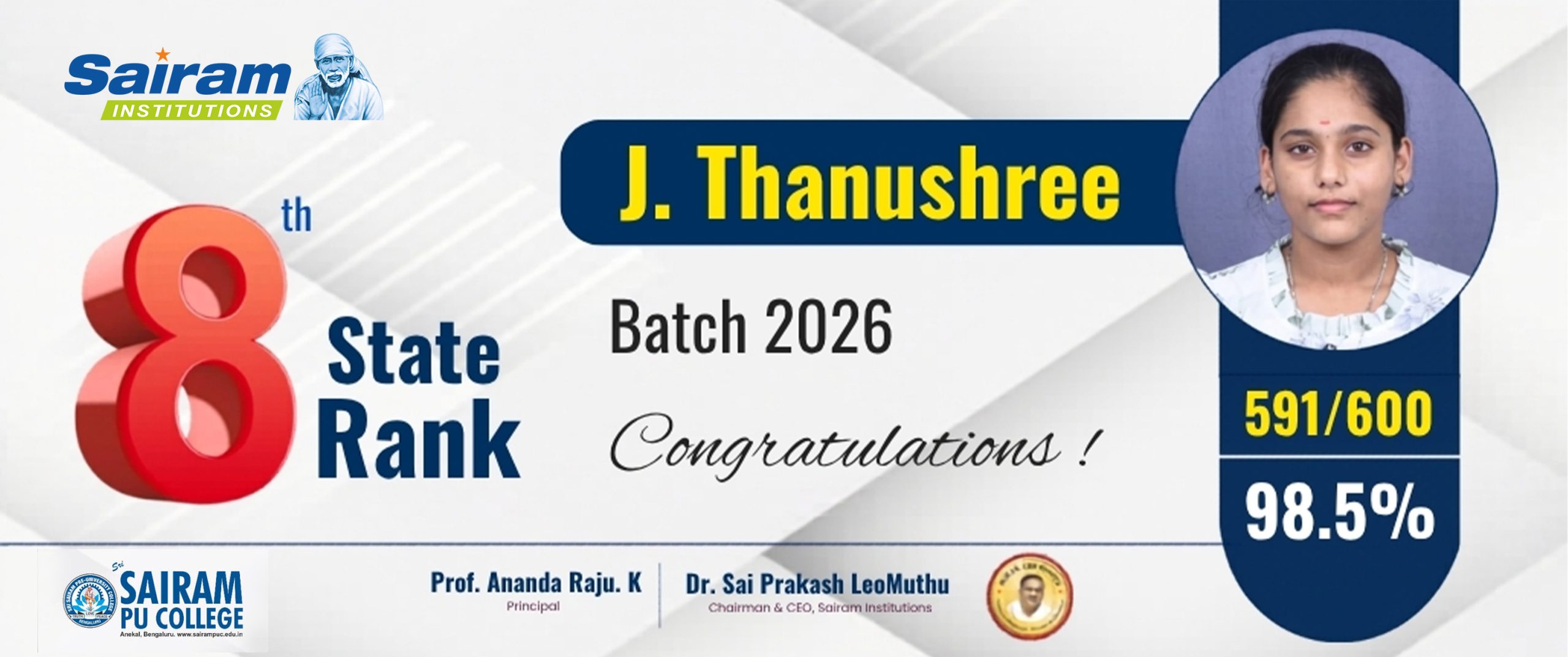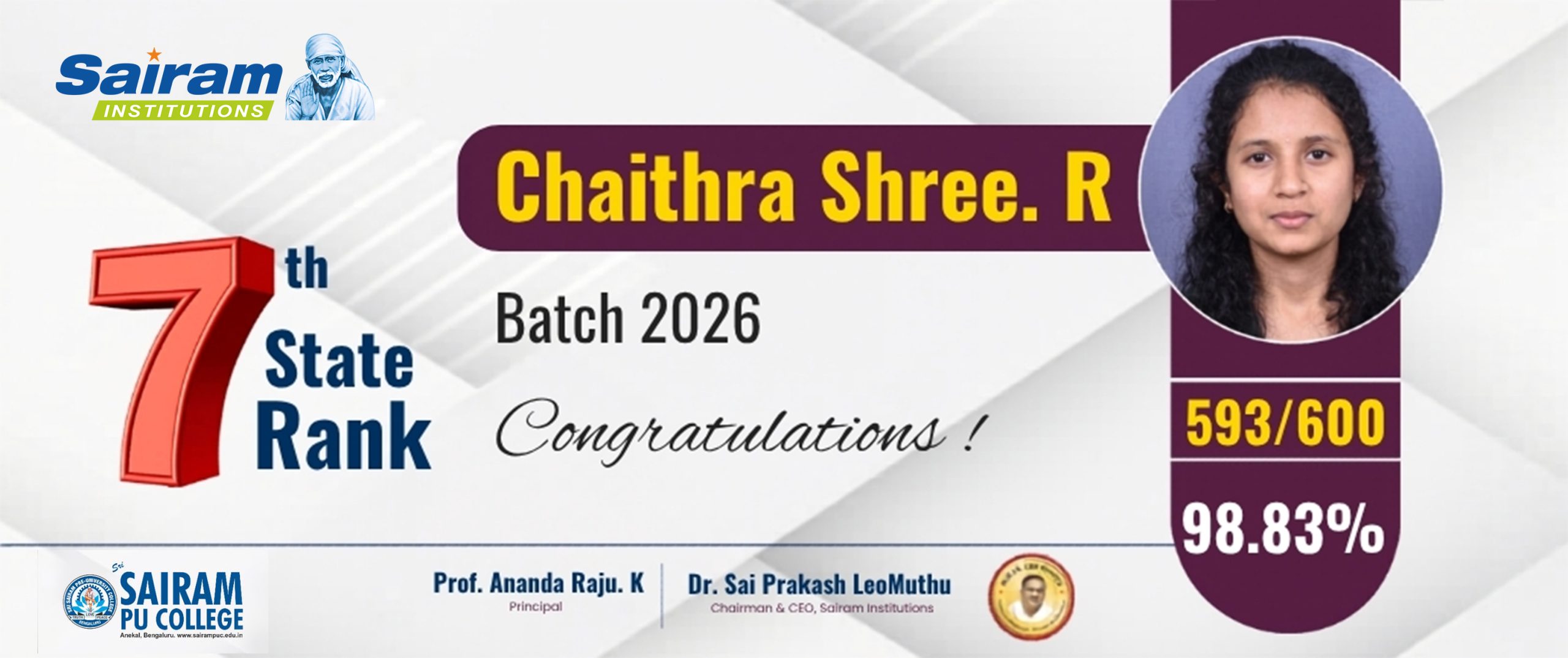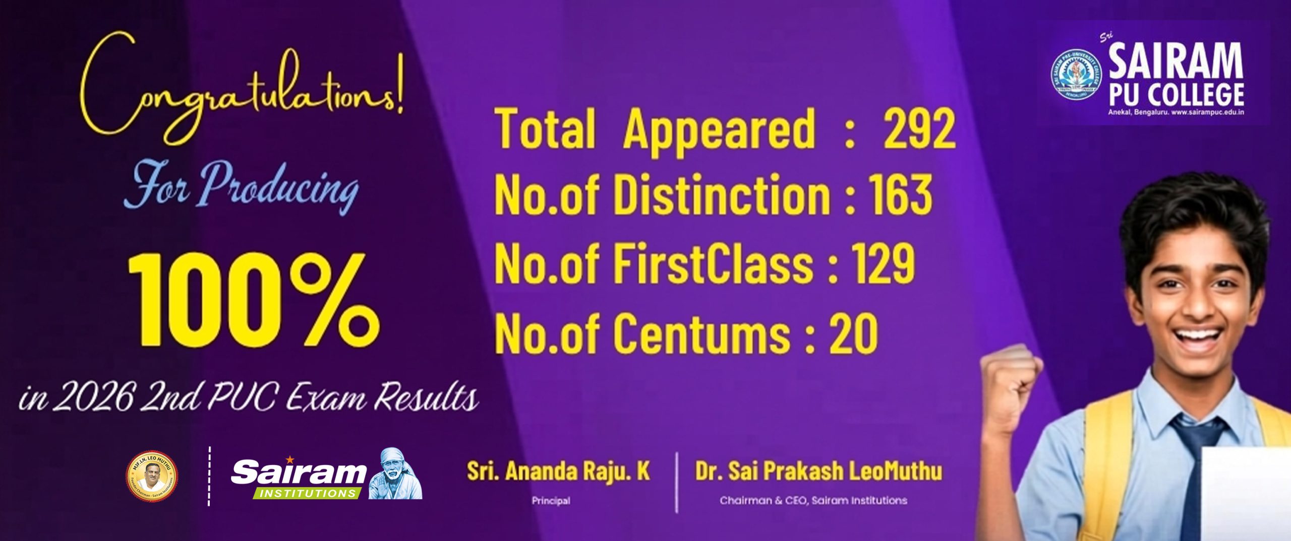 Sri Sairam PU College is an epitome of intelligence and decrees for education which proposes an absolute contemporary amenities' with malleable space in which everything from ensuing with digitized classrooms to laboratories, library to auditorium, hostels to cafeteria is state-of-the-art. Sri Sairam PU College has scholastically and pertinently consummated four predominant existences and is in flowing into its eighth year of its Service in the empire of Pre-University education.