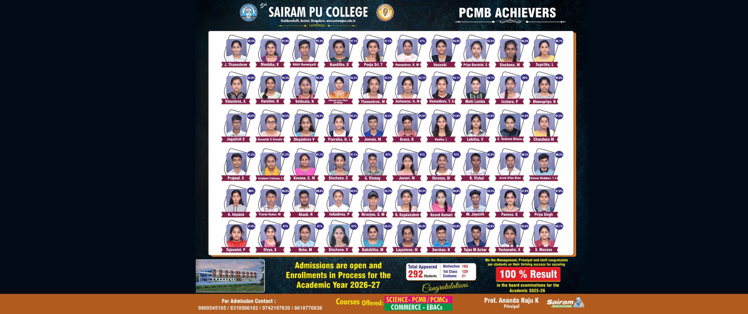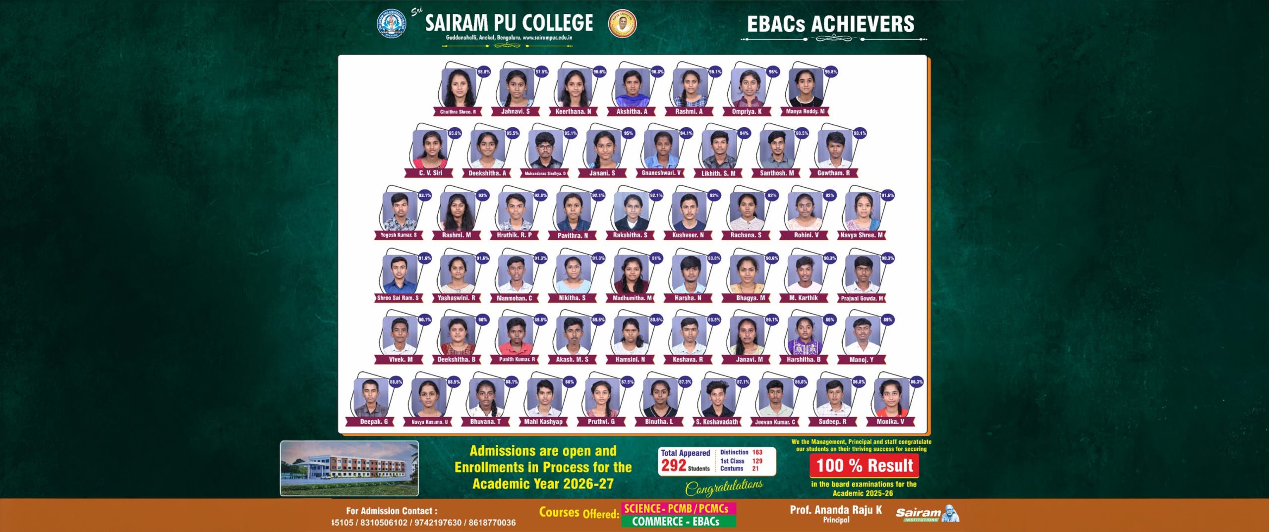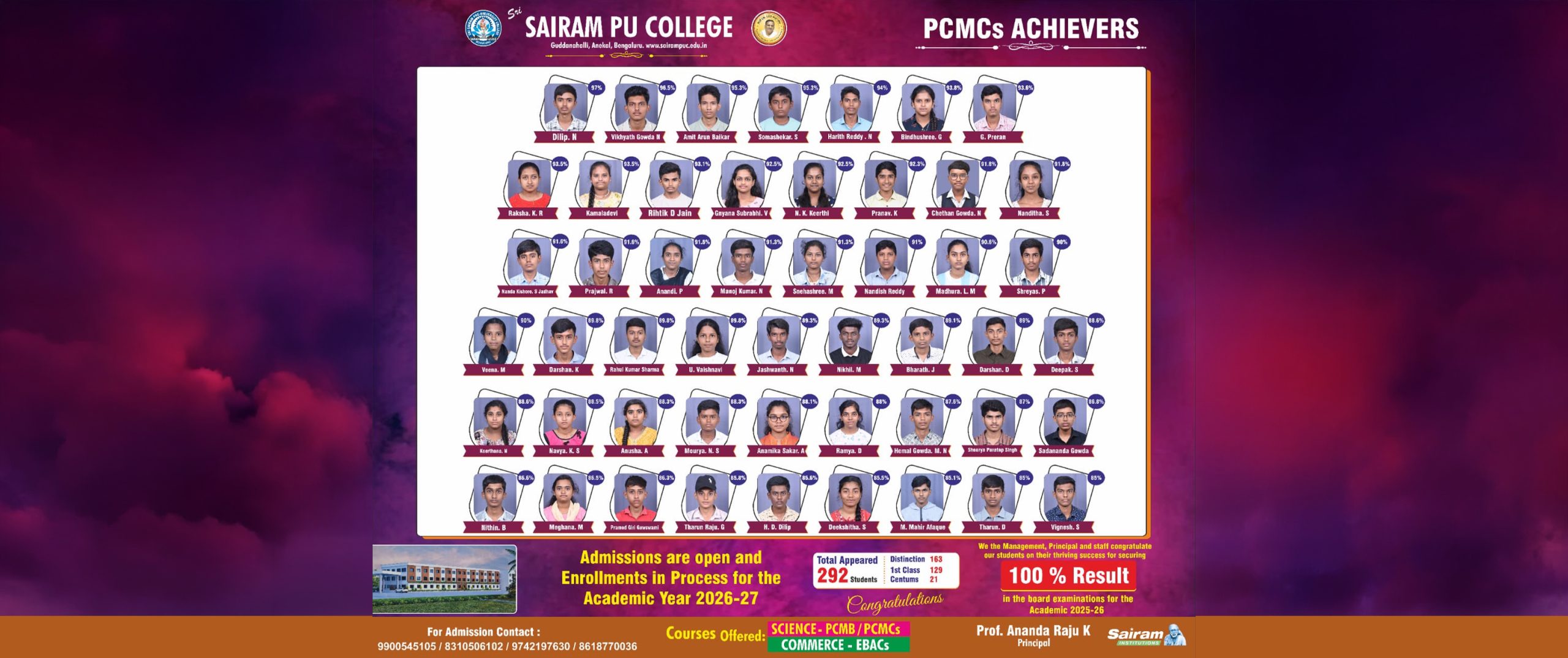 Sri Sairam PU College is an epitome of intelligence and decrees for education which proposes an absolute contemporary amenities' with malleable space in which everything from ensuing with digitized classrooms to laboratories, library to auditorium, hostels to cafeteria is state-of-the-art. Sri Sairam PU College has scholastically and pertinently consummated four predominant existences and is in flowing into its eighth year of its Service in the empire of Pre-University education.